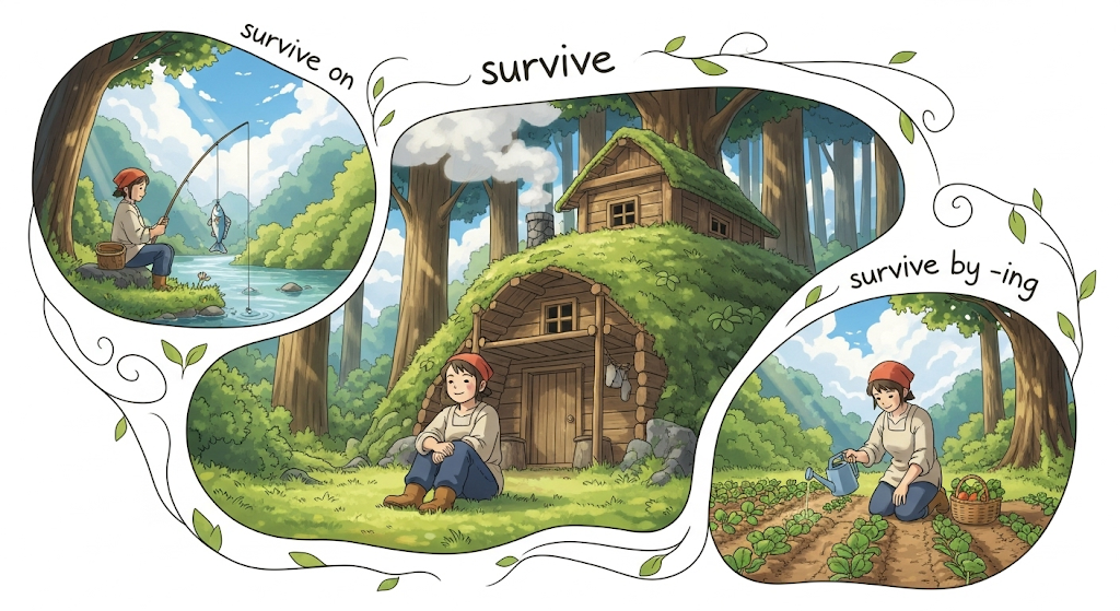 - *survive**는 생존의 기본 동사이며, 'on'은 의존하는 자원을, 'by'는 생존하는 수단을 구체적으로 나타냅니다.