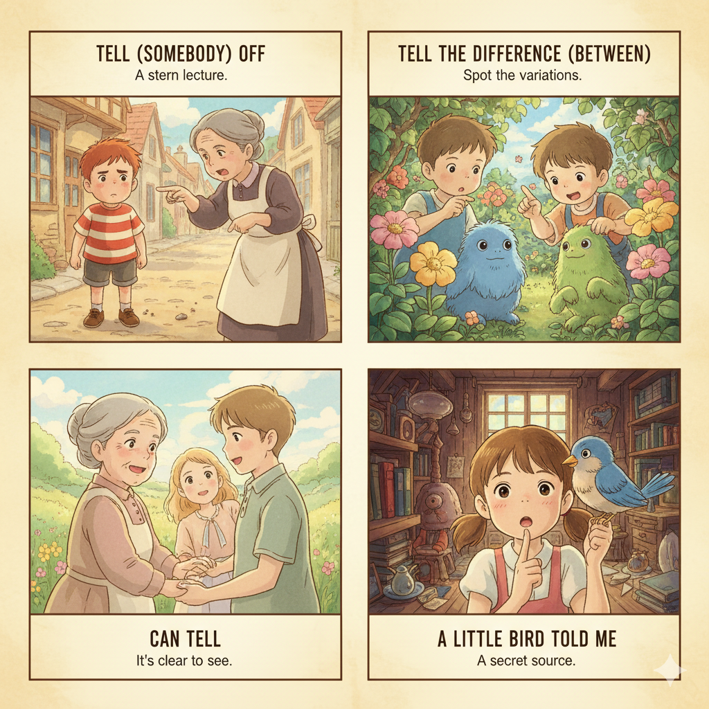 tell (somebody) off , tell the difference (between) , can tell , a little bird told me