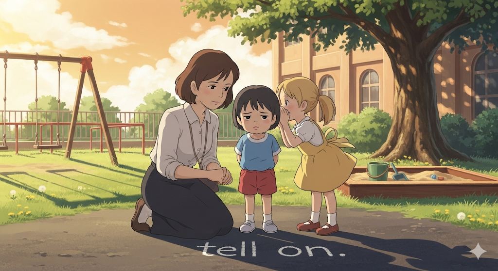| on | ~에 대해 | 전치사로, '고자질' '의' '대상'. | '누군가' '의' '잘못' '을' '고발하는' '대상이' '특정' '사람' '임을' '명시함'. |