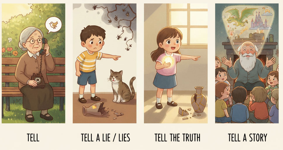 Day23 - tell , tell (somebody) (something) , tell a lie/lies , tell the truth , tell on (someone) , tell (somebody) a story , tell (somebody) off , tell the difference (between) , can tell , tell tales , a little bird told me