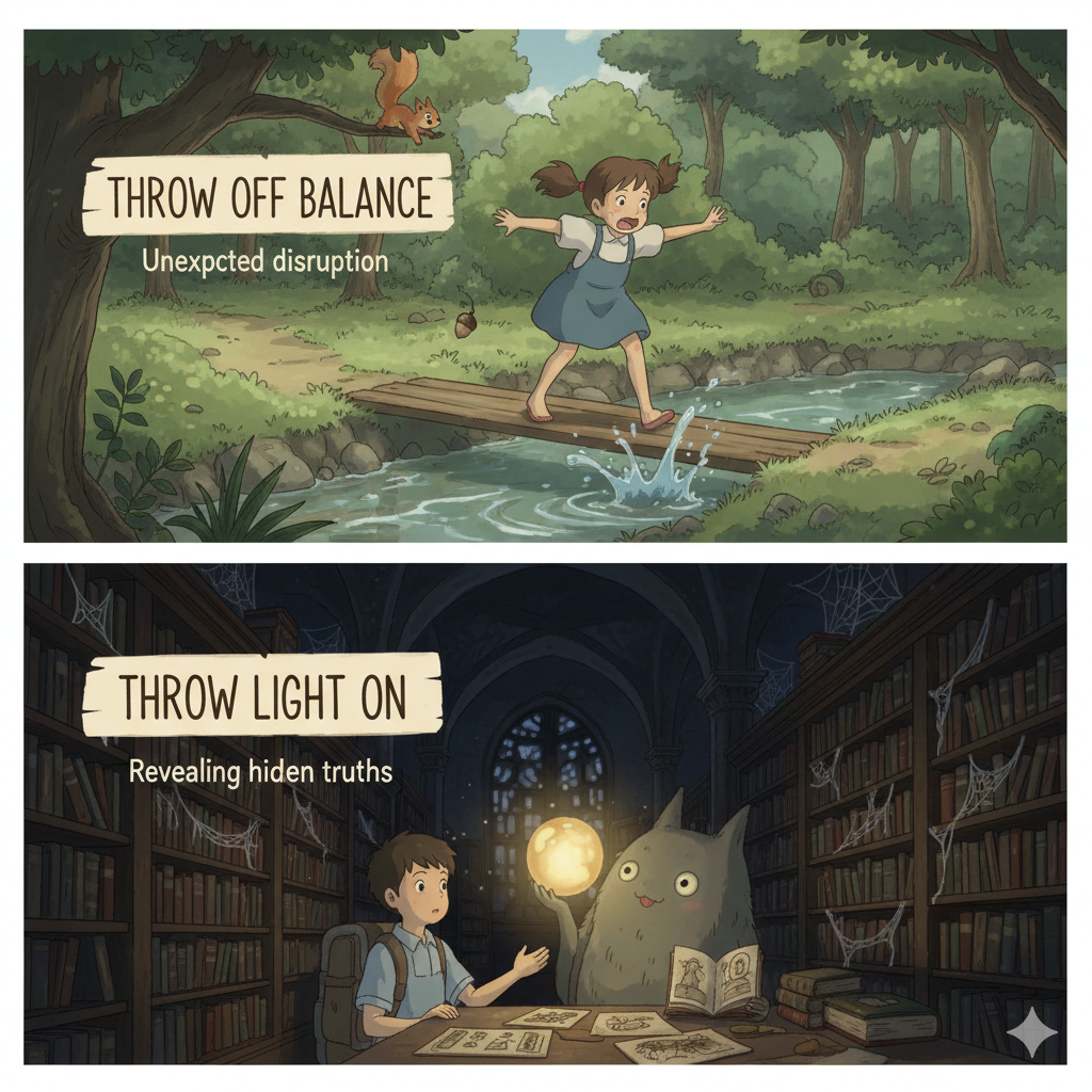 - *throw off balance**는 안정성 상실을, throw light on은 숨겨진 사실을 명확히 밝히는 것을 의미합니다.