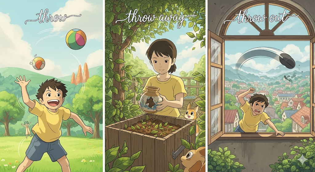 - "throw away", "throw out"처럼 매우 기본적이면서도 시험에 자주 나오는 구동사부터, "throw in" (덤으로 주다, 불쑥 말하다, 항복하다), "throw off" (벗다, 피하다), "throw light on" (밝히다) 등 고급 표현도 중요하다.