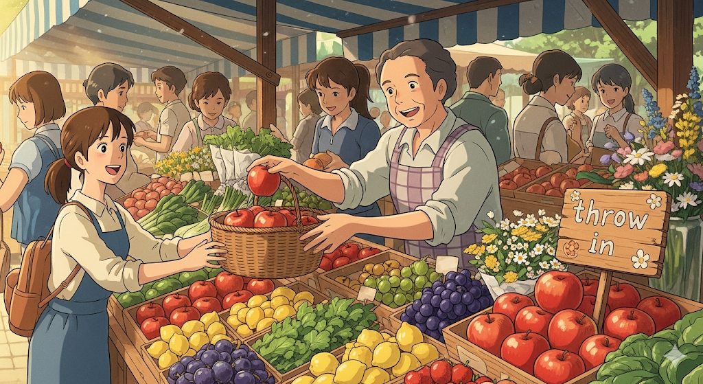 - 예문: If you buy this phone, we'll throw in a free charger.