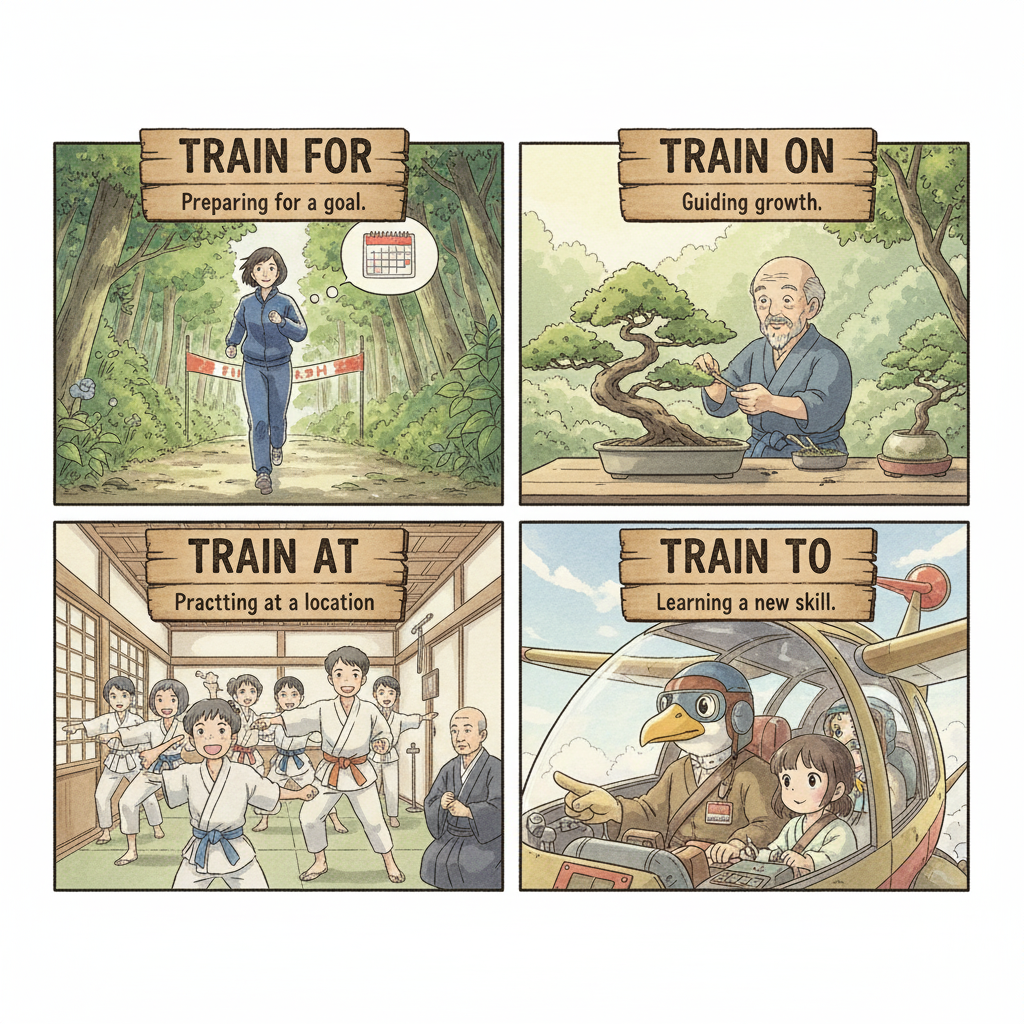 - "train up", "train for", "train on", "train at", "train to" 등은 각각 대상이나 목적, 장소에 따라 구체적인 의미 변화가 있으므로 반드시 구분해서 학습해야 한다.