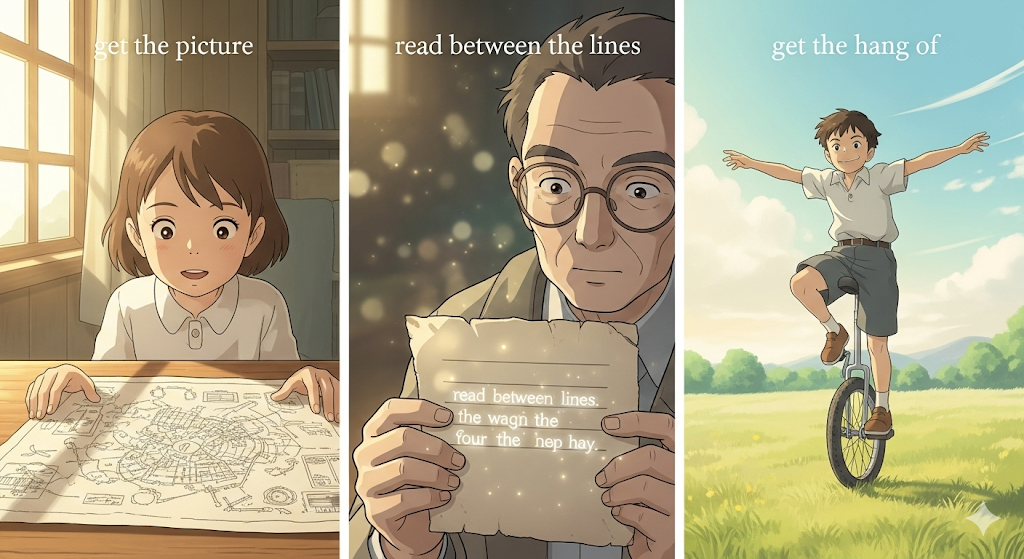 - *get the picture**는 전체 상황 파악을, read between the lines는 숨겨진 의도 파론을, get the hang of는 실용적 기술 숙달을 의미합니다.