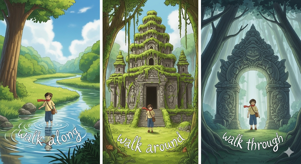 - 예) We walked along the river.He walked around the park.They walked through the forest.