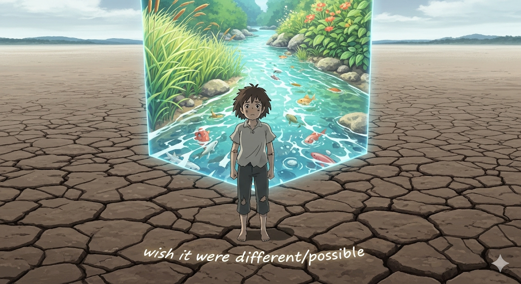 '현재'(present) '사실'(fact)이 '특정' '결과'(result) 때문에 '바람직하지'(undesirable) 않거나 '불가능'(impossible)하다고 '느껴', '그것'이 '현실'과 '반대'(contrary)되는 '다른'(different) '상태'이기를 '강렬하게'(strong) '소망'(wish)하는 행위를 의미합니다. '후회'(regret)나 '무력감'(helplessness)을 강조합니다.