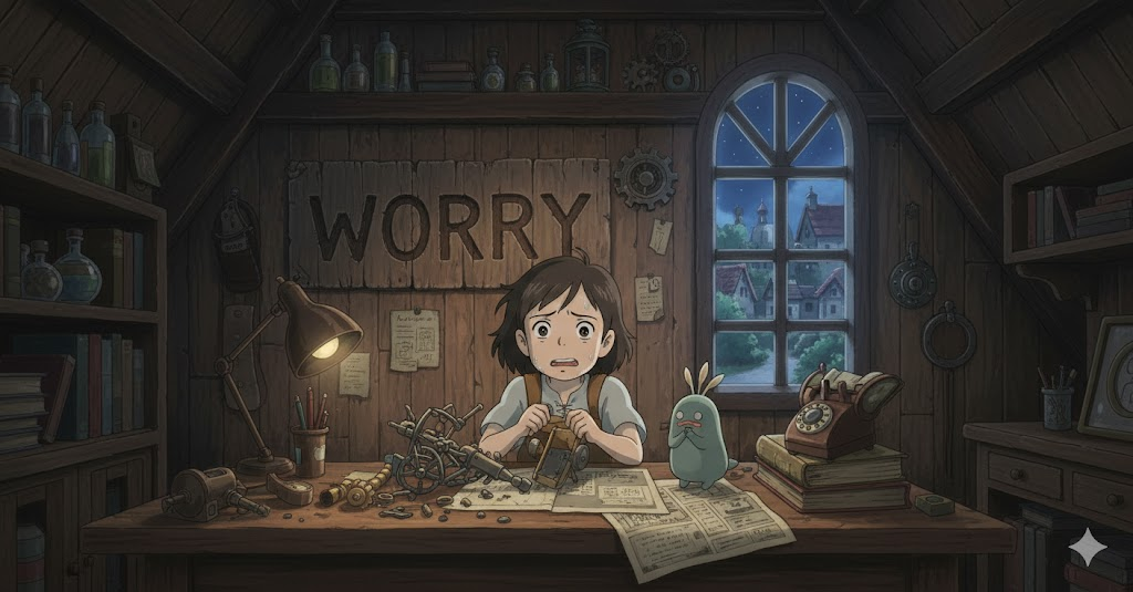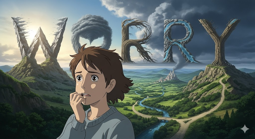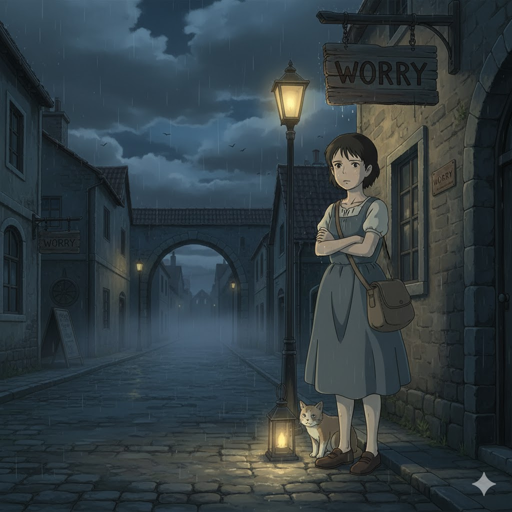 '개인의'(personal) '삶'(life), '경력'(career), '재정'(financial), 또는 '세계'(world)의 '불확실한'(uncertain) '미래'(future)에 '대해', '부정적인'(negative) '결과'(consequence)를 '예상'(anticipate)하며 '염려'(worry)하는 행위를 의미합니다. '예측'(prediction) 불가능한 '시간'(time)과 '계획'(plan)에 대한 '통제'(control) 부족을 강조합니다.