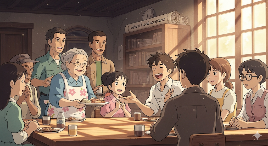 문화적/사회적 수용. 특정 아이디어, 행동, 사람 등이 사회나 문화에 받아들여지는 현상.