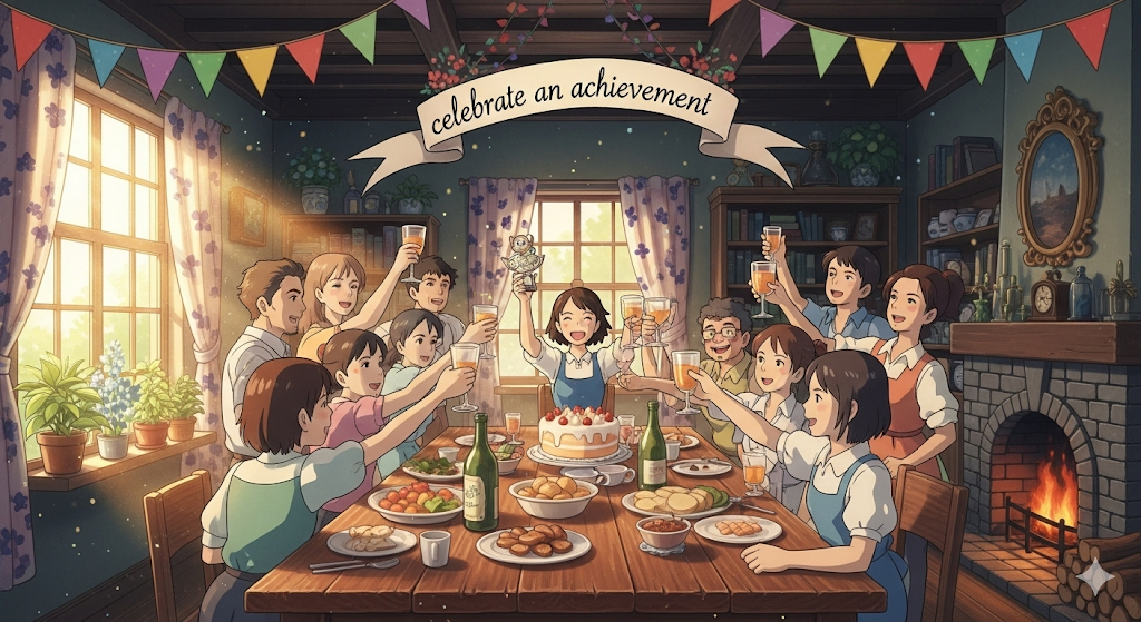 - *'celebrate an achievement'**는 성공을 공식적으로 또는 비공식적으로 축하하는 상황에서 사용됩니다.