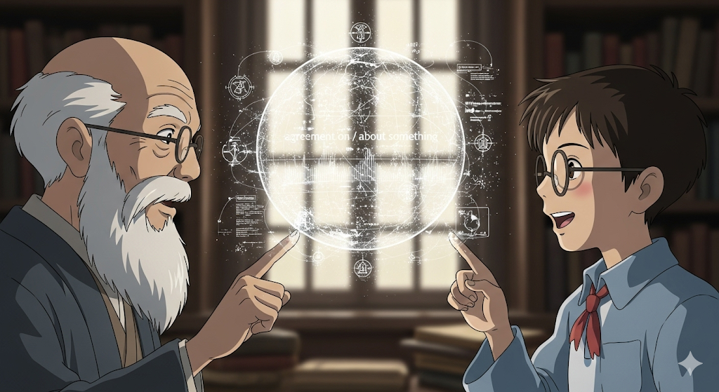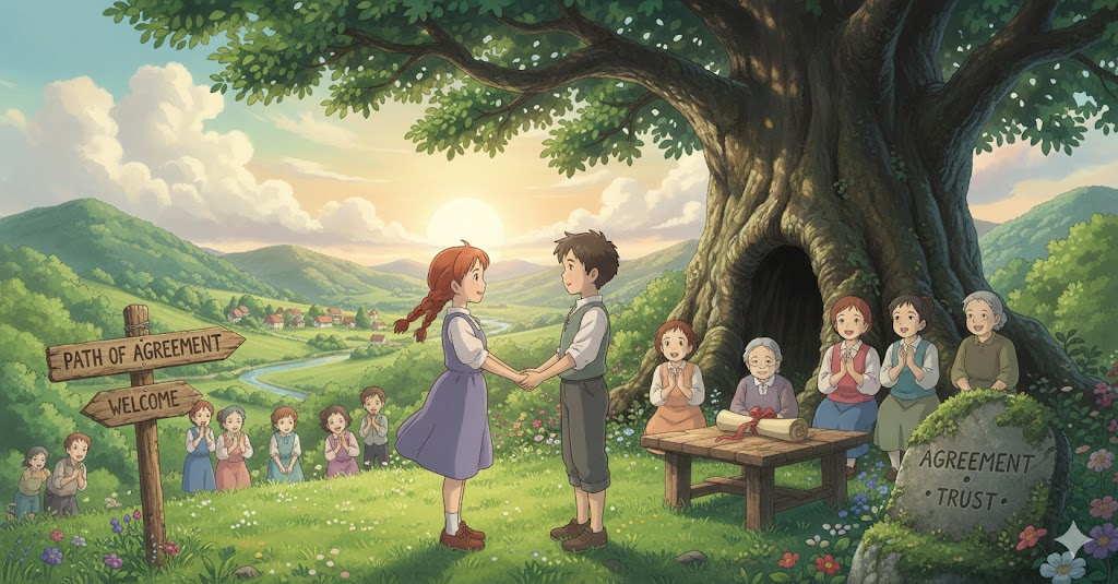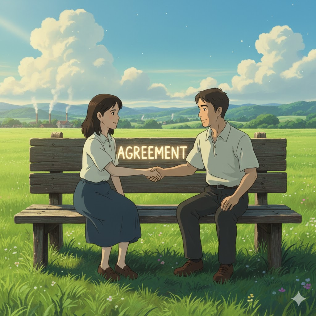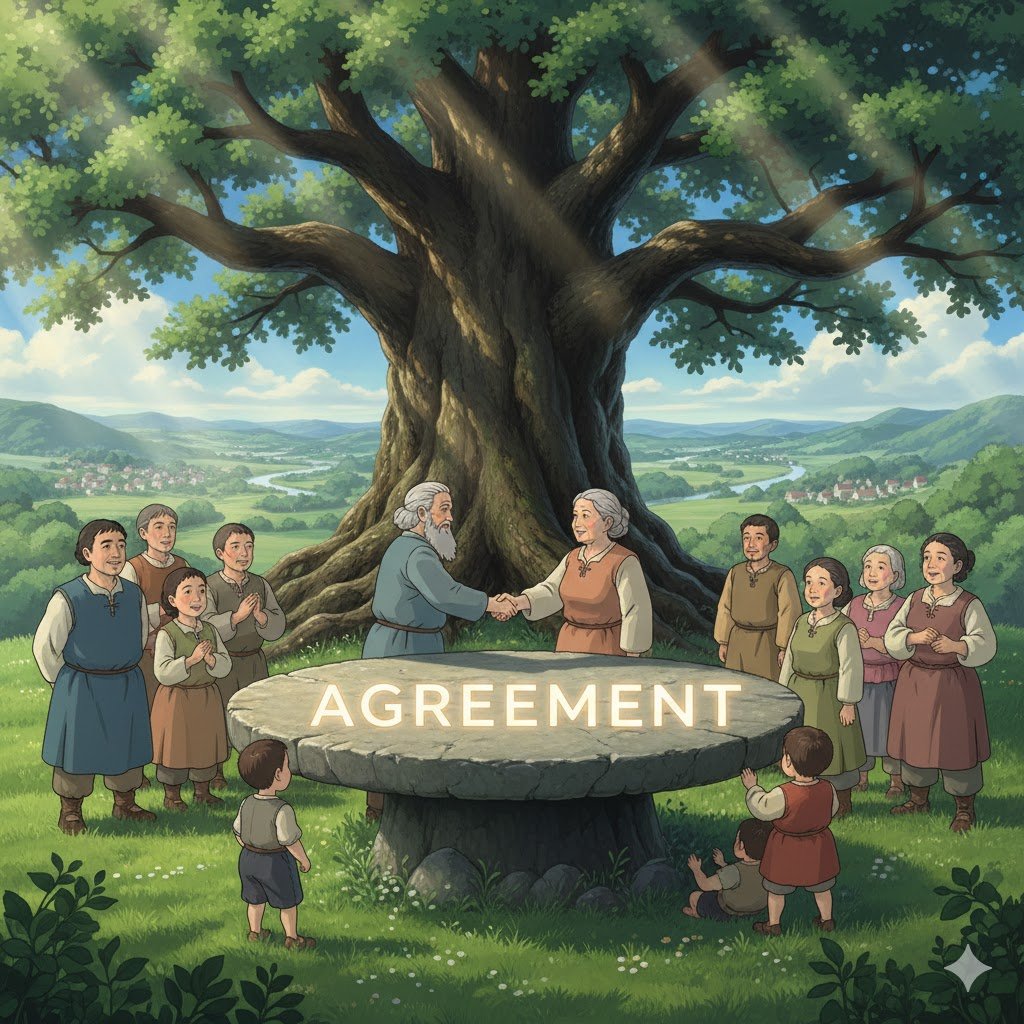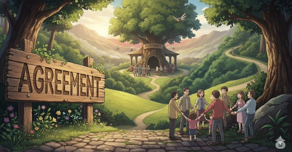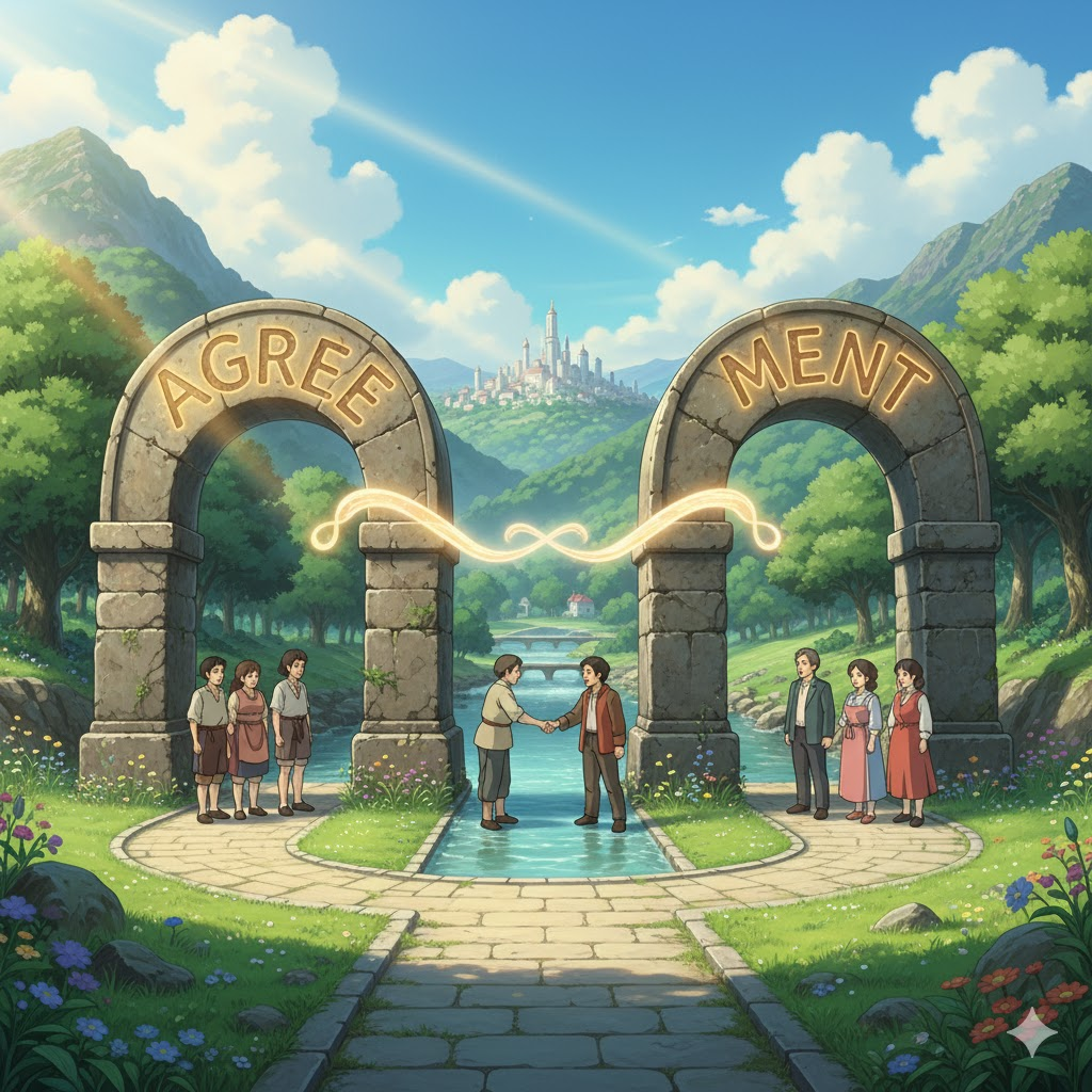 '둘'(two) 이상의 '당사자'(parties)가 '특정'(specific) '주제'(subject), '조건'(terms), 또는 '계획'(plan)에 대해 '상호'(mutual) '이해'(understanding)를 '바탕'(basis)으로 '동의'(consent)하고 '약속'(promise)을 '맺는' '공식적'(official) 또는 '비공식적'(informal)인 '상태'(condition)나 '문서'(document)를 의미합니다. '분쟁'(dispute) '해결'(solve)과 '협력'(cooperation)의 '기반'(foundation)을 강조합니다.