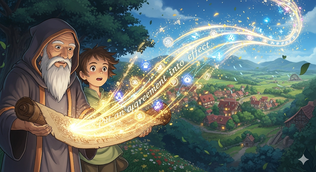 합의된 내용이 현실에서 실행되도록 하는 것을 의미합니다. 서류상의 약속을 실제 행동이나 결과로 옮기는 과정을 강조합니다.