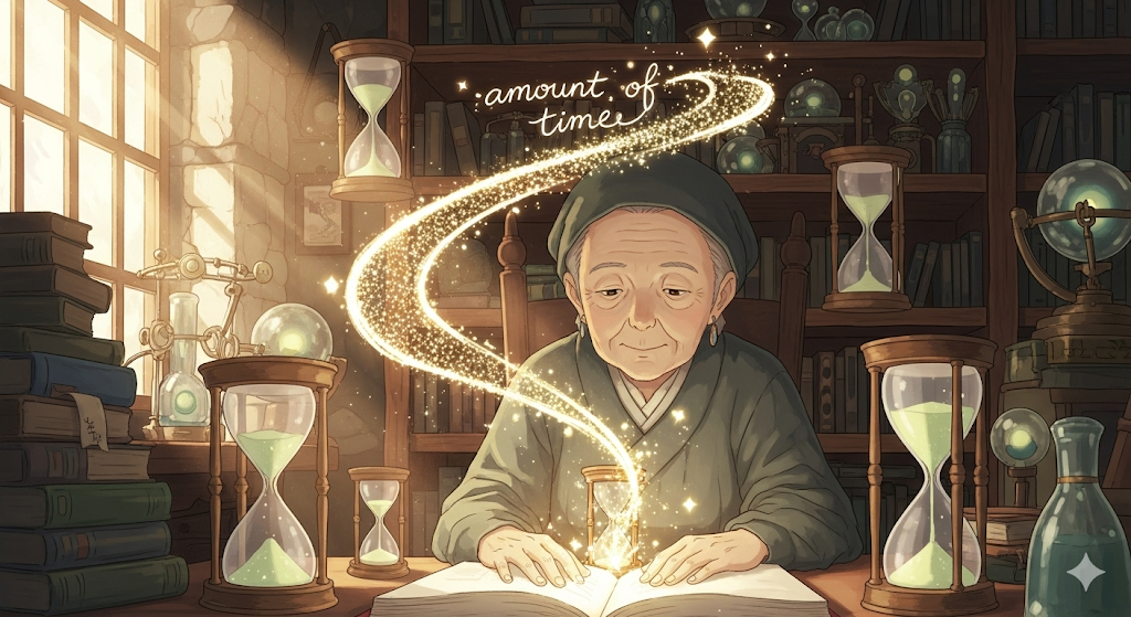 | amount | 양 | 명사로, '시간' '의' '총량'. | of time과 결합하여 '시간' '이라는' '추상적인' '개념을' '측정' '가능한' '양' '으로' '표현함'. |