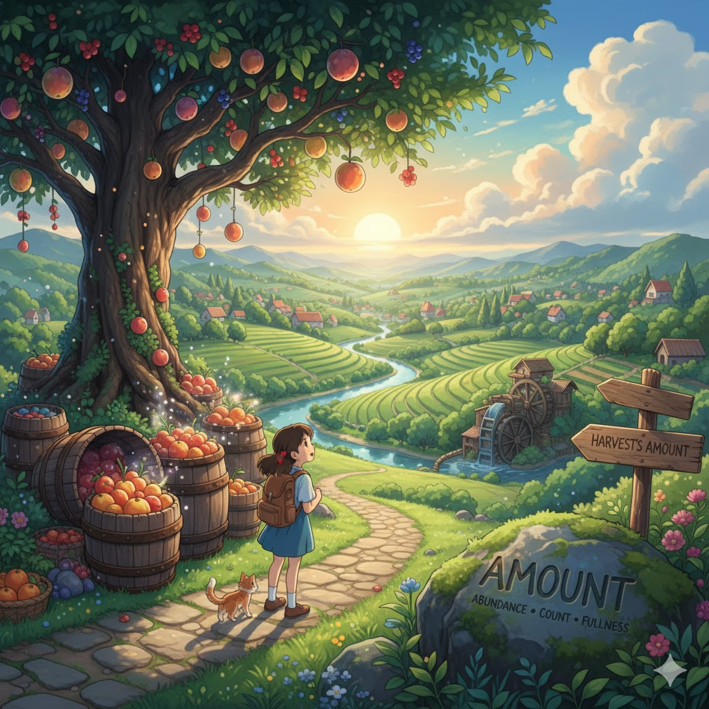 amount [əˈmaʊnt] 수량이나 크기를 나타내는 느낌, 계산과 관련