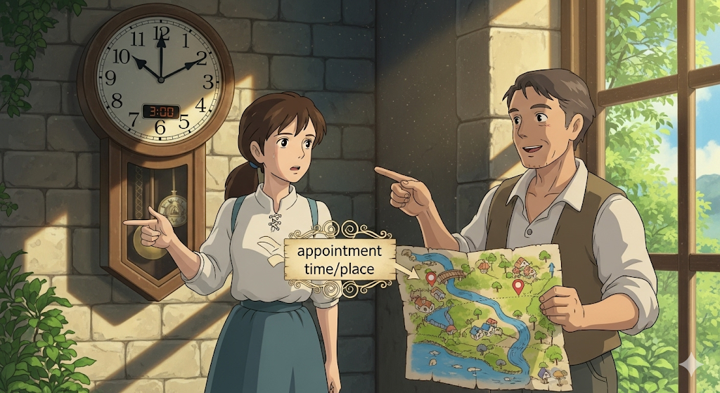 약속 시간/장소. 만남이 이루어질 구체적인 시간과 장소.