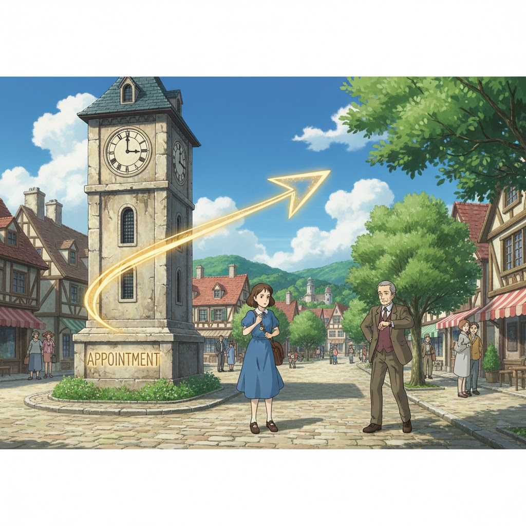 약속을 잡다, 일정을 계획하다. 미래의 특정 시간으로 약속을 정하는 행위.