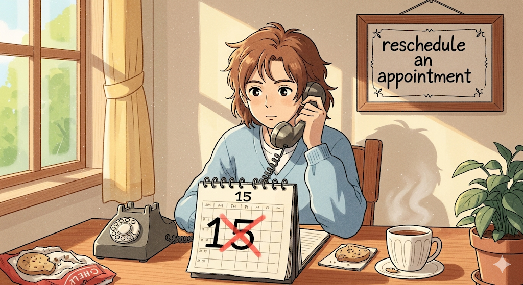 - *'reschedule an appointment'**는 갑작스러운 상황 변화에 따라 일정을 조정할 때 유용하게 사용되는 표현입니다.
