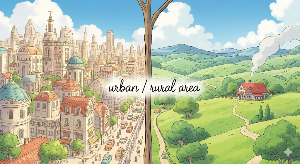 - *'urban/rural area'**는 지리적, 사회적, 경제적 차이를 설명하는 데 사용되는 기본적인 개념입니다.