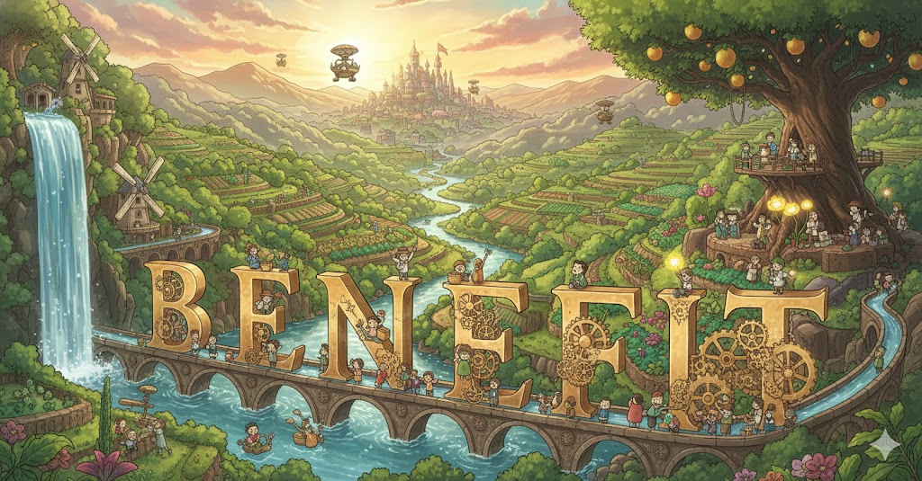 '특정' '행위'(action), '상황'(situation), 또는 '정책'(policy)이 '개인'(individual), '집단'(group), 또는 '시스템'(system)에 '가져다주는' '긍정적'(positive)이거나 '유리한'(favorable) '결과'(result)나 '이점'(advantage)을 의미합니다. 단순히 '물질적'(material)인 '이득'(gain)을 넘어, '건강'(health), '능력'(ability), 또는 '복지'(welfare) 향상을 포괄하는 개념에 초점이 맞춰집니다.
