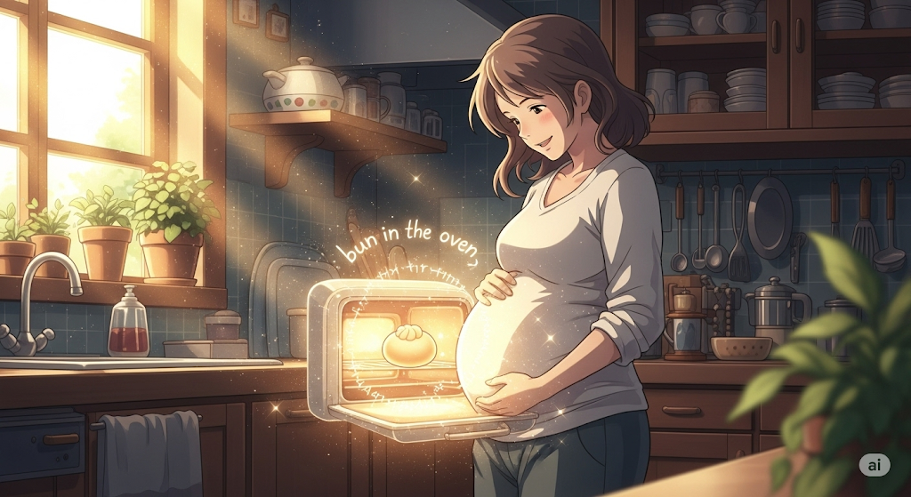 - 예문: My mom told me there’s a bun in the oven—we’re having a baby. (엄마가 임신했다고 말씀하셨어요 — 아기가 생겼어요.)