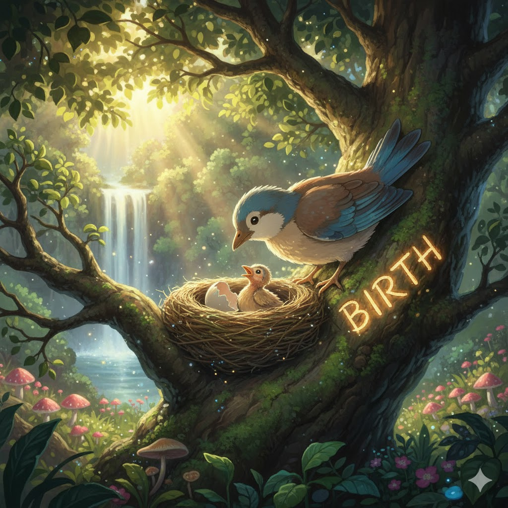 '생물'(organism)이 '어머니'(mother)의 '몸'(body) 밖으로 '나와', '독립적'(independent)인 '존재'(existence)로 '삶'(life)을 '시작'(start)하는 행위를 의미합니다. 단순히 '탄생'을 넘어, '아이디어'(idea)나 '국가'(nation)의 '기원'(origin)이나 '시작'을 비유적으로 나타내는 데 초점이 맞춰집니다.