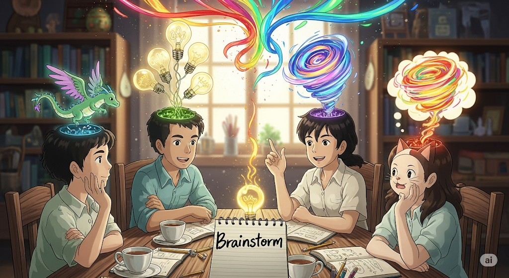 혼자 또는 여럿이서 자유로운 분위기 속에서 어떤 문제에 대한 새로운 아이디어를 다양하게 내는 것을 의미합니다.