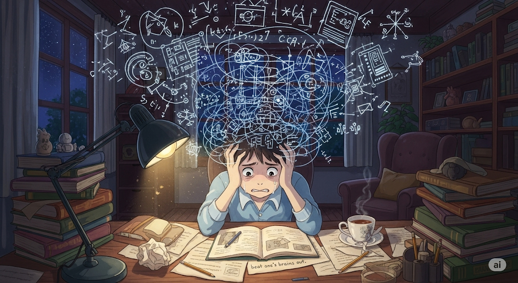 - 예문: He beat his brains out to solve the math problem.