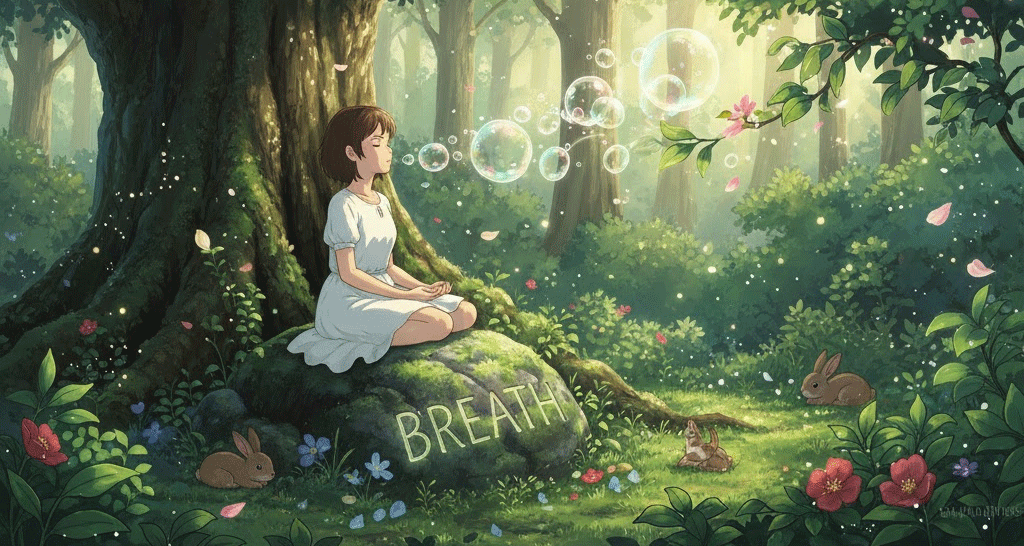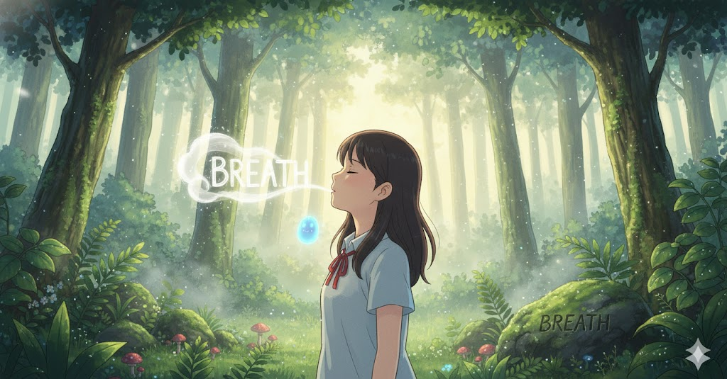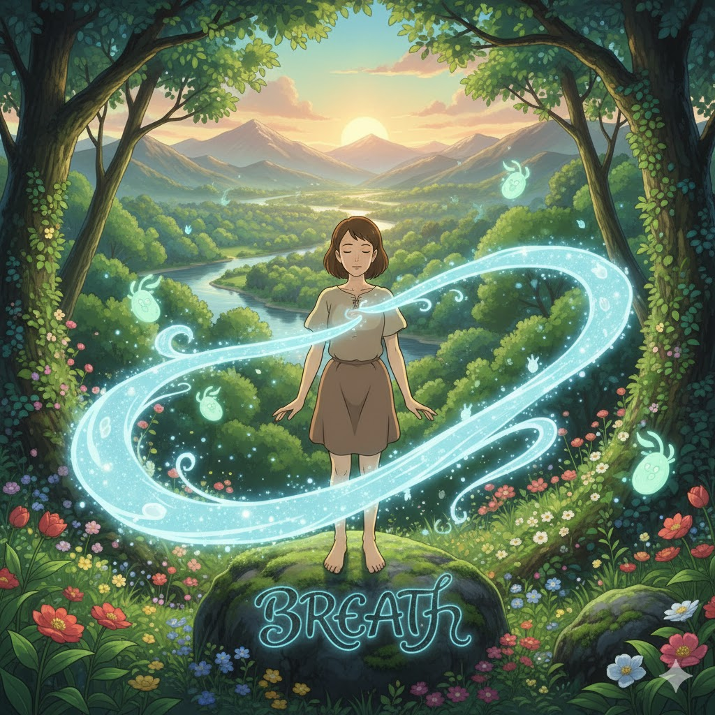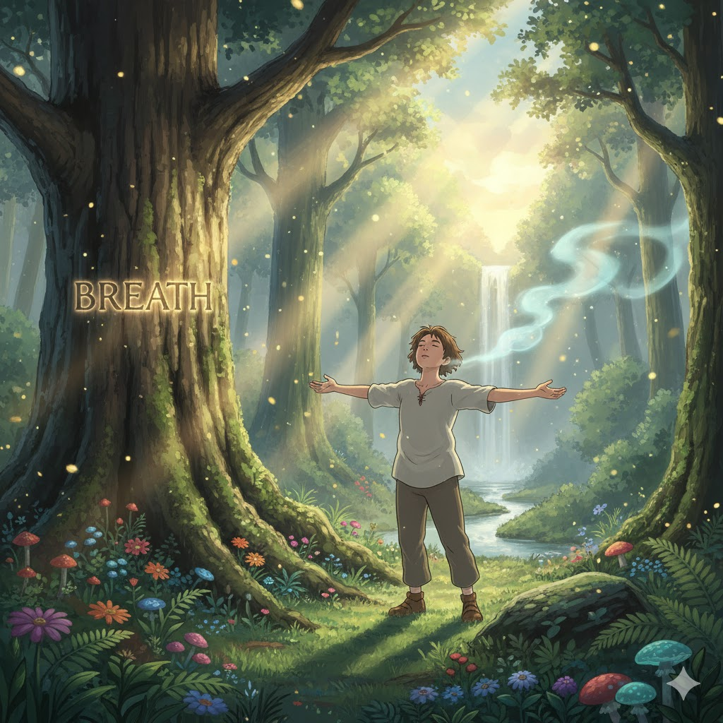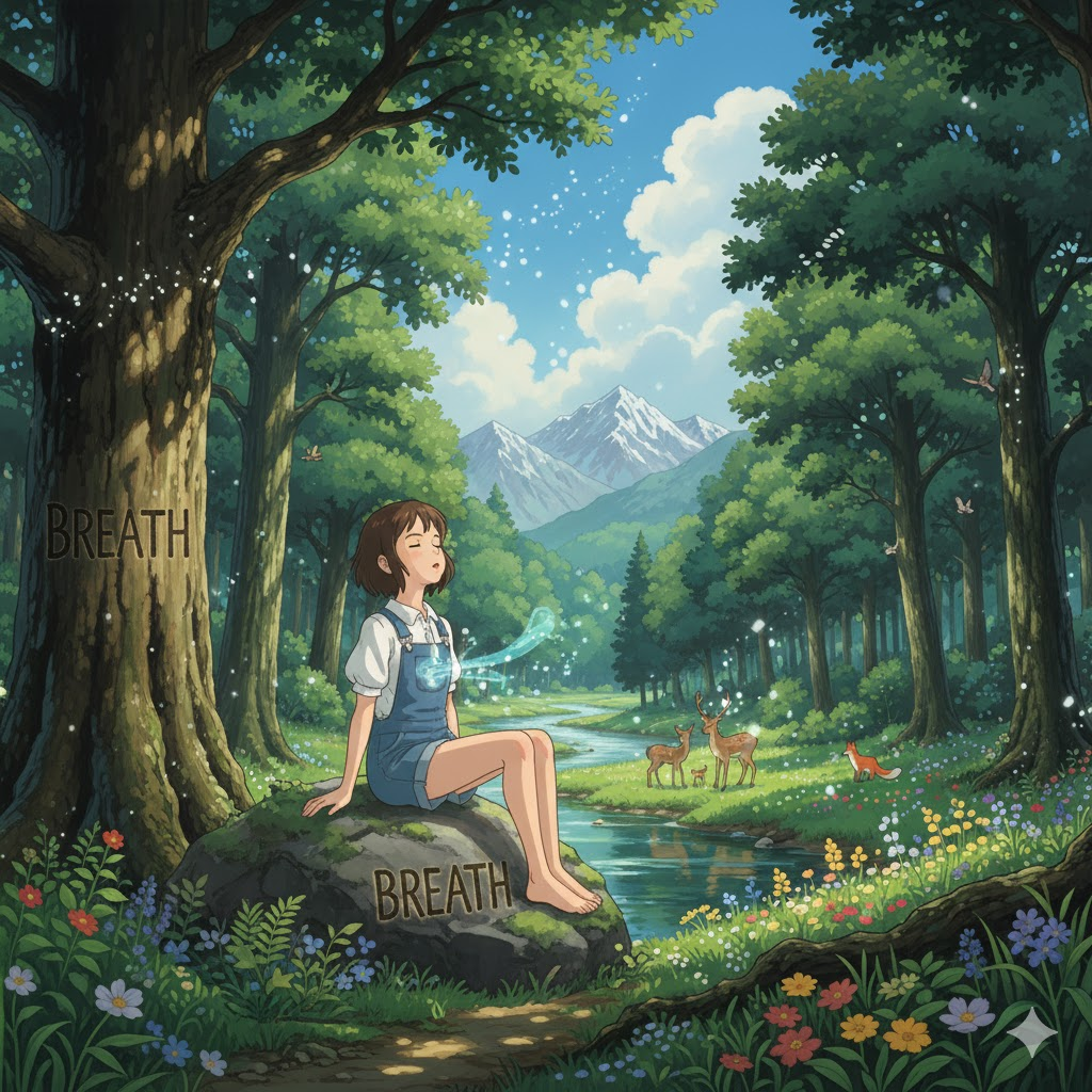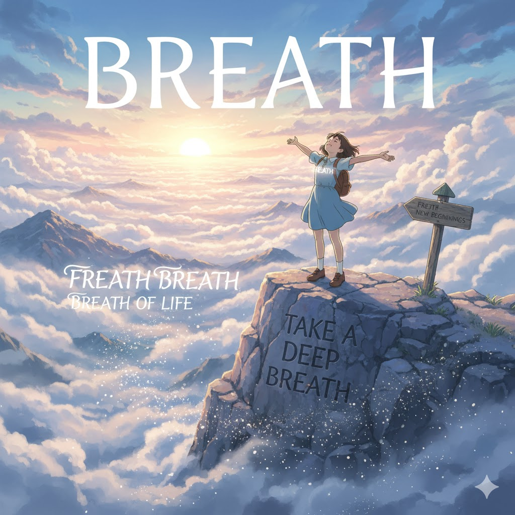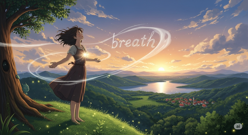 '공기'(air)를 '폐'(lungs) '속'(inside)으로 '들이마시고'(inhale) '내쉬는'(exhale) '생명'(life) 유지의 '기본적인'(basic) '행위'(action)를 의미합니다. 단순히 '호흡'을 넘어, '잠깐'(moment)의 '휴식'(rest), '새로운'(new) '활력'(energy), 또는 '소통'(communication)을 위한 '말'(speech)의 '시작'(start)을 비유적으로 나타내는 데 초점이 맞춰집니다.