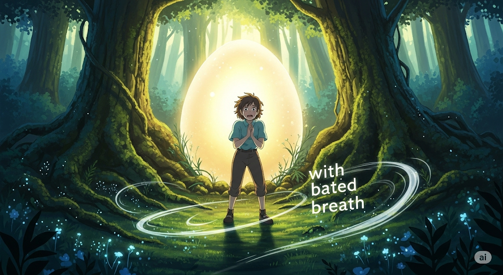 - *'with bated breath'**는 중대한 소식이나 사건을 기다리는 사람의 강렬한 긴장감과 기대를 시적으로 표현하는 관용구입니다.