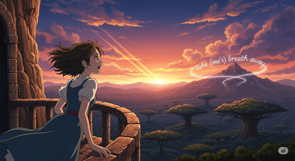 '매우'(very) '아름답거나'(beautiful), '놀랍거나'(surprising), 또는 '감동적인'(moving) '장면'(scene)이나 '경험'(experience)이 '자신의'(one's) '호흡'(breath)을 '가져가'(take away) '잠시'(momentarily) '숨'을 '멈추게'(hold breath) 만드는 '극적인'(dramatic) '감정적'(emotional) '반응'(response)을 의미합니다. '경탄'(awe)과 '놀라움'(surprise)을 강조합니다.