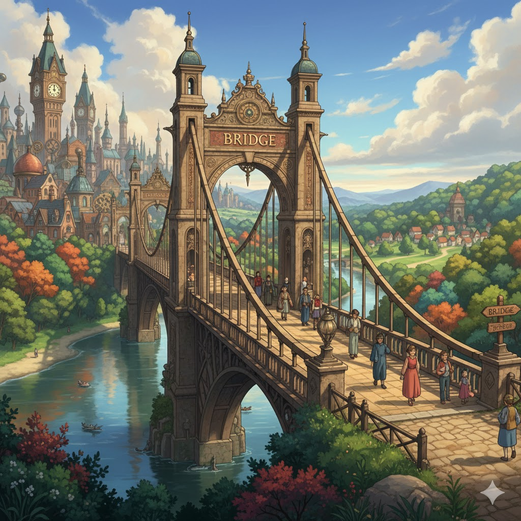 '물'(water), '도로'(road), 또는 '장애물'(obstacle) '위'(over)를 '가로질러'(across) '두'(two) '지점'(point)을 '연결'(connect)하여 '통행'(passage)을 '허용'(allow)하는 '구조물'(structure)을 의미합니다. 단순히 '물리적'(physical)인 '다리'를 넘어, '갈등'(conflict), '문화'(culture), 또는 '이해'(understanding)의 '차이'(difference)를 '해결'(solve)하는 '수단'(means)을 비유적으로 나타내는 데 초점이 맞춰집니다.