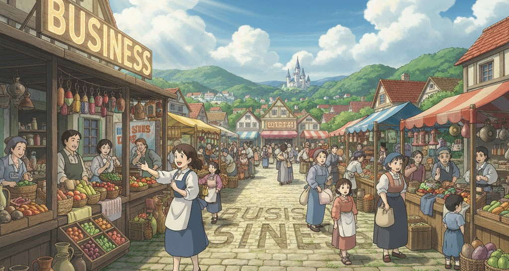 '이익'(profit)이나 '수익'(revenue)을 '창출'(create)할 '목적'(purpose)으로 '상품'(goods)이나 '서비스'(service)를 '생산'(produce)하거나 '판매'(sell)하는 '조직적'(organized)인 '활동'(activity)이나 '기업'(firm)을 의미합니다. 단순히 '일'(work)을 넘어, '거래'(deal), '상업'(commerce), 또는 '개인의'(personal) '주된'(main) '업무'를 포괄합니다.