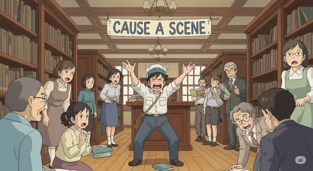 - 예문: He caused a scene at the restaurant because of the poor service. (그는 형편없는 서비스 때문에 식당에서 소란을 피웠다.)