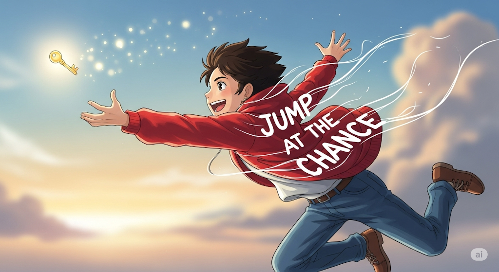 | jump | 점프하다, 뛰어오르다 | 동사로, 빠른 움직임. | 기회를 잡는 행위가 매우 빠르고 적극적임을 강조. |