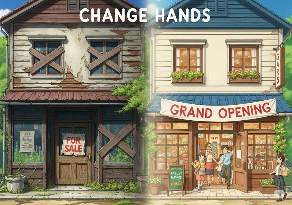 '재산'(property), '사업체'(business), 또는 '물건'(object)의 '법적'(legal) '소유권'(ownership)이 '이전'(former) '주인'(owner)에서 '새로운'(new) '주인'에게 '넘어가는'(transfer) 행위를 의미합니다. '거래'(deal)나 '매각'(sale)을 통한 '소유'(possession) '주체의'(subject) '변화'(change)를 강조합니다.
