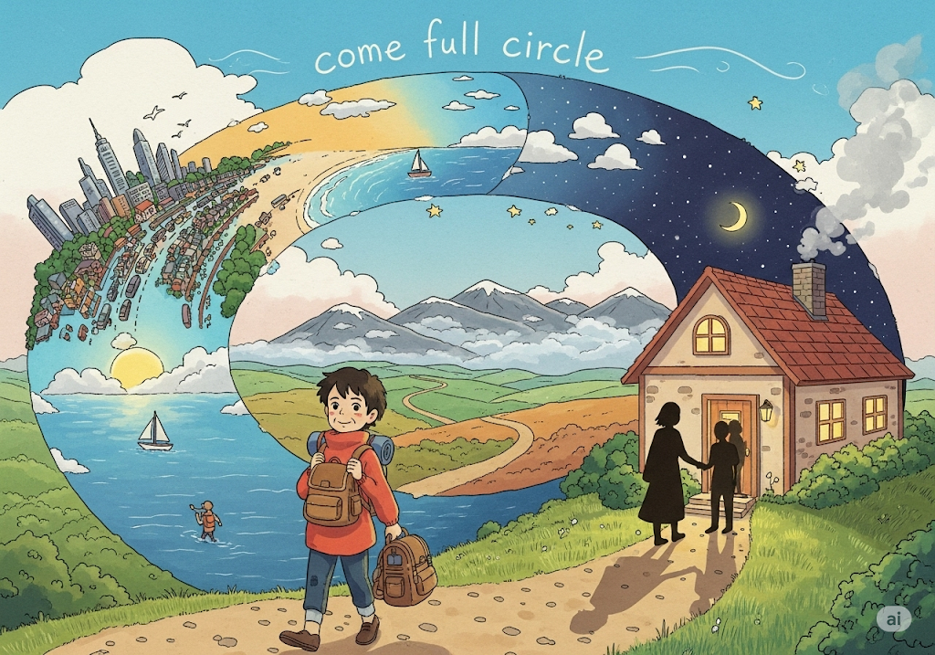 - She returned to her hometown after years and felt she had come full circle. (그녀는 수년 후 고향으로 돌아왔고 완전히 한 바퀴 돈 것처럼 느꼈다.)