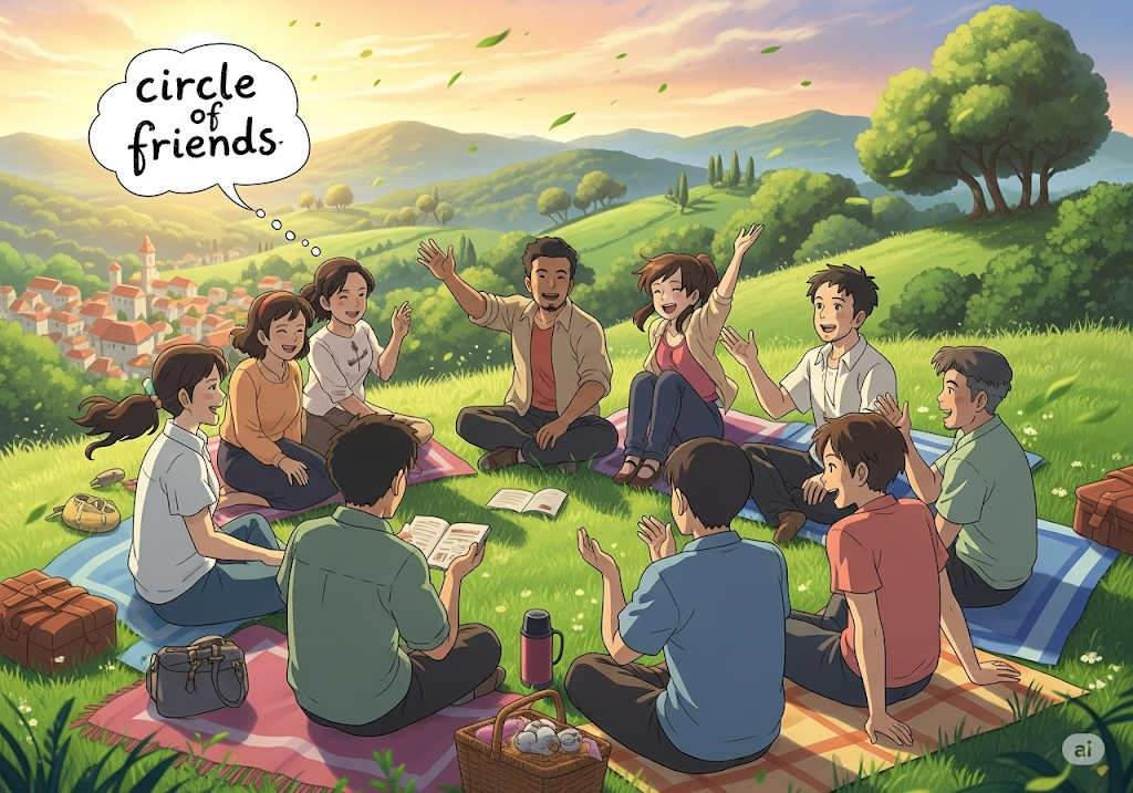 - *'circle of friends'**는 서로에게 신뢰와 유대감을 느끼는 친밀한 친구 그룹을 지칭하는 긍정적인 표현입니다. 이 표현은 친구들 간의 끈끈한 관계와 공동체 의식을 강조하는 뉘앙스를 담고 있습니다.