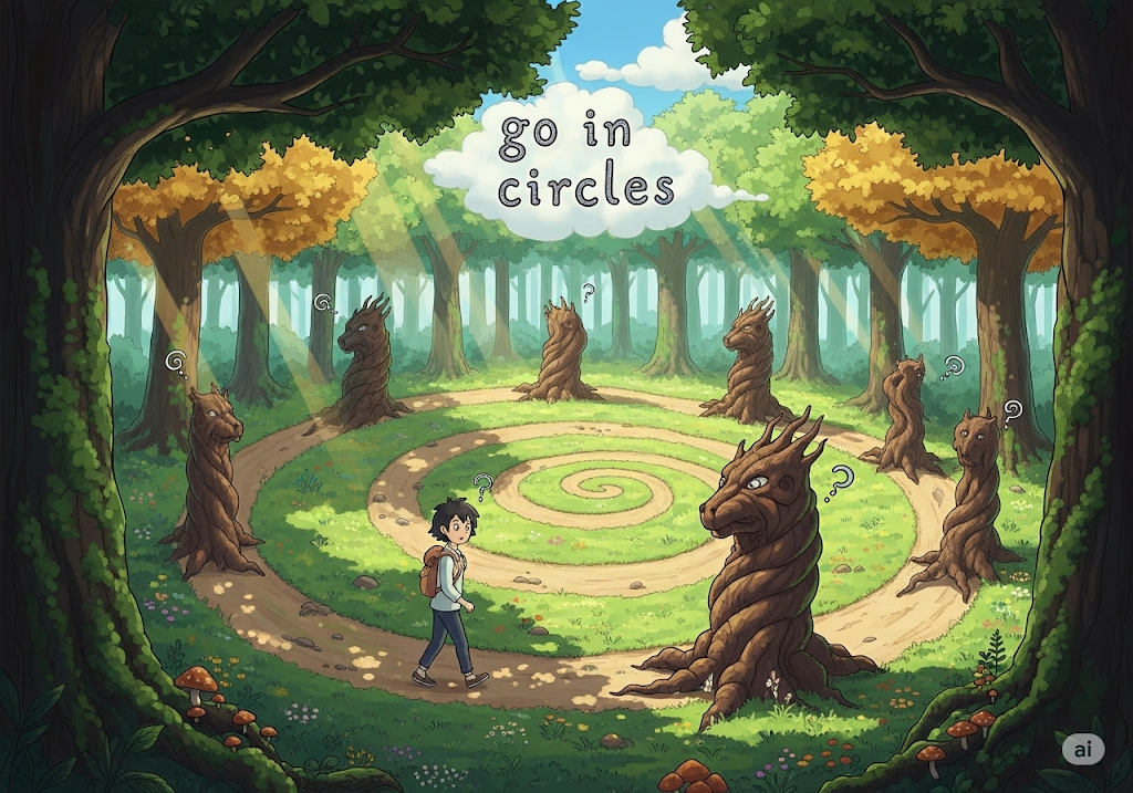 - 예문: We’ve been going in circles trying to solve this problem. (우리는 이 문제를 해결하려고 헛돌고 있다.)