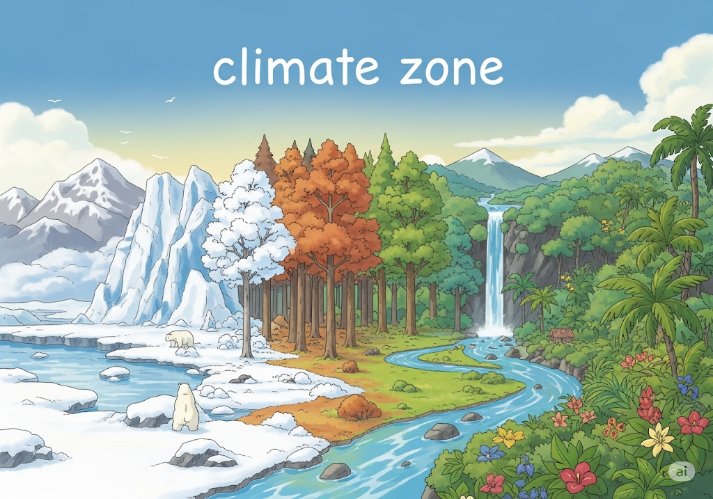 - 예문: Korea is located in the temperate climate zone. (한국은 온대 기후대에 위치해 있다.)