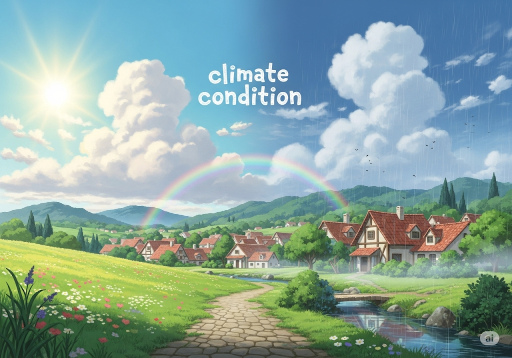 - *'climate condition'**은 어떤 지역의 기후를 구성하는 요소들을 구체적으로 설명할 때 사용되는 표현입니다. 장기적이고 평균적인 기후의 상태를 나타내므로, 단기적인 현상인 '날씨(weather)'와는 구분되는 개념입니다.