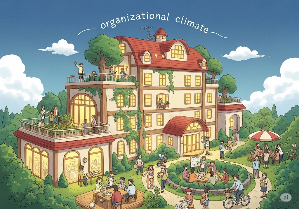 조직 풍토, 조직 분위기. 조직의 구성원들이 회사의 정책, 절차, 리더십, 그리고 동료와의 관계 등 전반적인 근무 환경에 대해 공통적으로 느끼는 분위기나 인식을 의미합니다. 이는 직원들의 사기, 생산성, 직무 만족도에 직접적인 영향을 미칩니다.