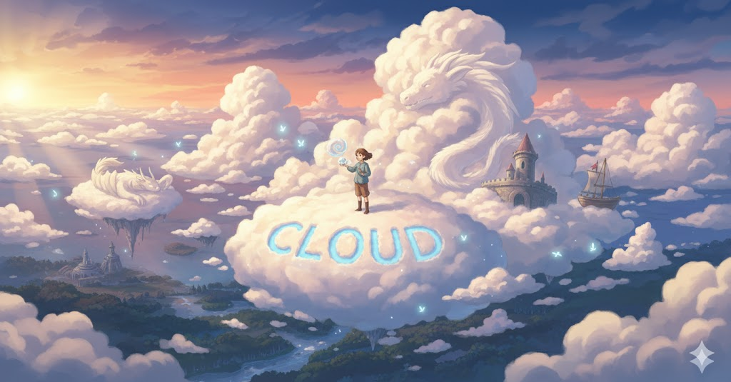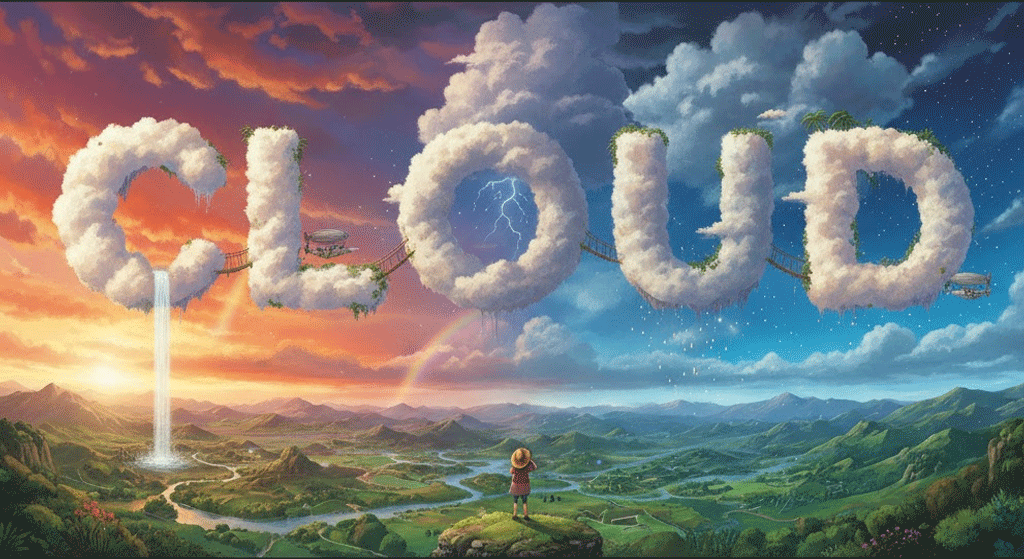 고대 영어 clūd ("바위, 언덕")에서 유래 → 12세기경부터 **'구름'**을 의미하게 됨 (구름이 바위나 언덕처럼 보였기 때문) → 원래 **'하늘의 덩어리'**를 의미했음 → 이 의미가 현대 영어에서 '대기 중의 물방울 응집체' (구름) 명사로 발전함. 나아가 '공중에 떠다니는 다른 물질의 덩어리' (연기, 먼지 등의 덩어리, 무리), 그리고 '인터넷 기반의 데이터 저장 및 처리 시스템' (클라우드 컴퓨팅)의 의미를 가지게 되었어요. 동사로는 '구름으로 덮어 불투명하게 만드는' (흐리게 하다, 흐려지다), 그리고 '표정이나 분위기를 어둡게 만드는' (어둡게 하다, 우울하게 하다) 의미를 가지게 되었어요. 즉, **'하늘의 물 덩어리, 다양한 공중 부유물, 추상적인 데이터 저장 공간, 그리고 불투명하거나 어둡게 만드는 행위'**를 나타내는 핵심 단어예요.
