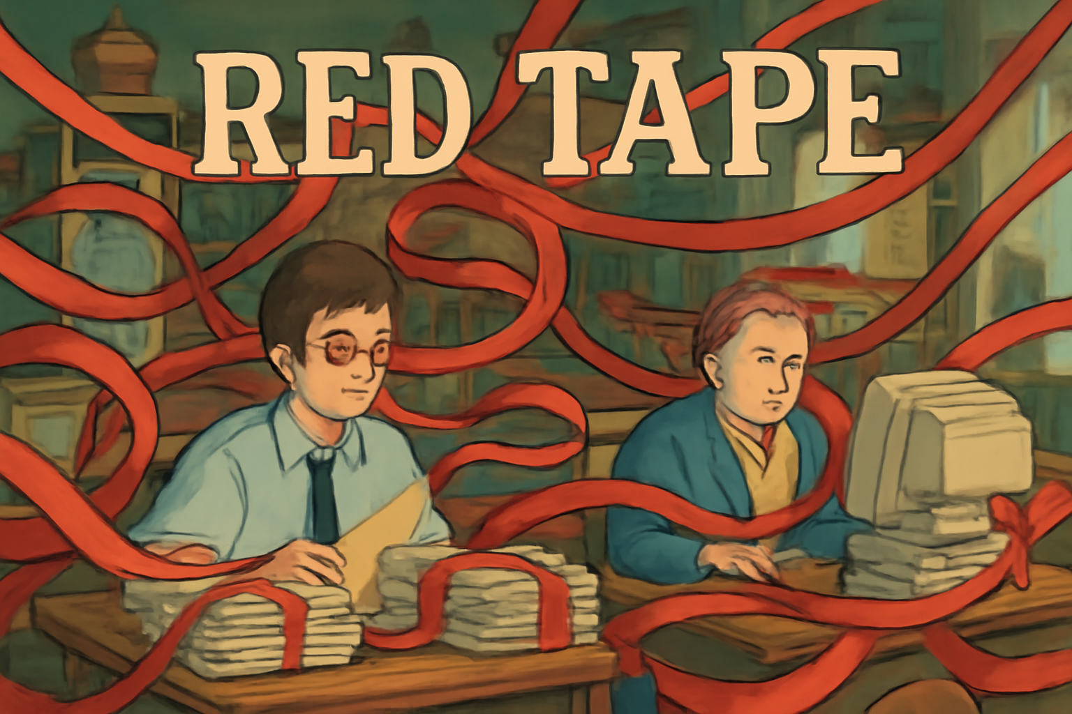 | tape | 끈, 테이프 | 명사로, '서류 묶음'을 상징. | '빨간색 끈'으로 묶인 '공식 서류'라는 비유를 통해, '복잡한 절차'를 구체화. |