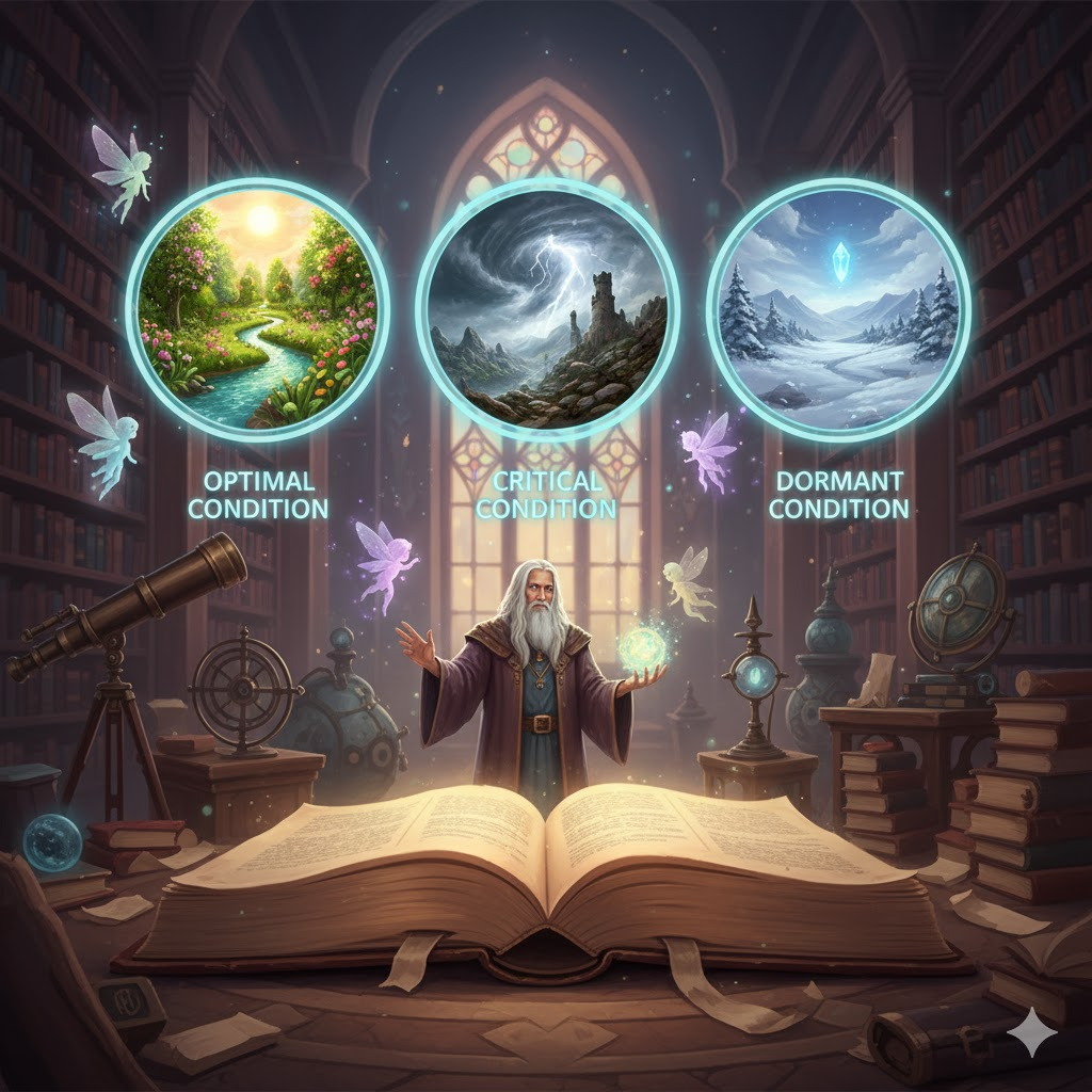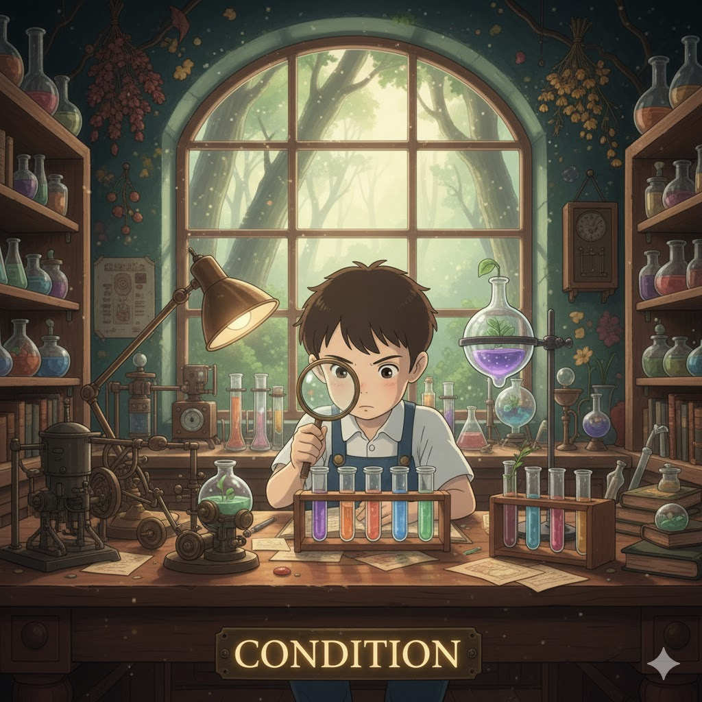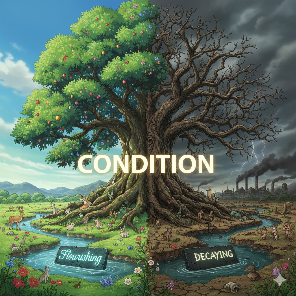 어떤 사물이나 사람의 현재 모습이나 상태를 의미합니다. '상태'라는 의미 외에, 어떤 일이 발생하기 위해 **반드시 충족되어야 하는 '전제 조건'**을 뜻하기도 합니다. 동사로는 어떤 행동이나 상황을 통제하거나 길들여 '결과를 좌우하는' 뉘앙스를 가집니다.