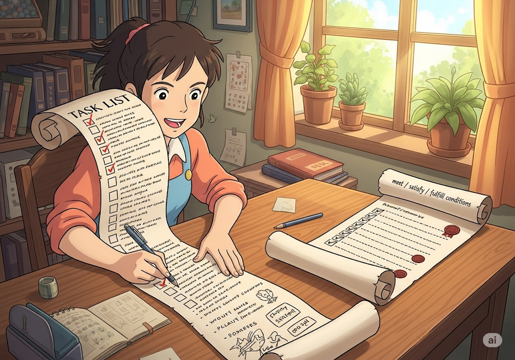 - 뜻: 조건을 충족/만족시키다