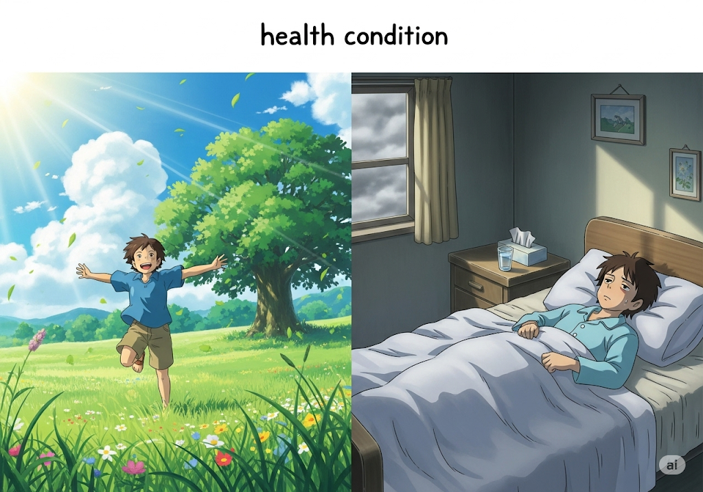 뉘앙스: 개인의 신체적 또는 정신적 건강이 어떤 상태에 있는지를 의미합니다. 병원에서 진단받은 질병이나 상태를 포함하여, 전반적인 건강 상황을 말할 때 사용됩니다.