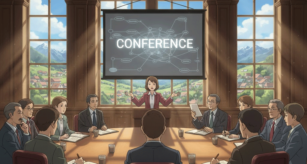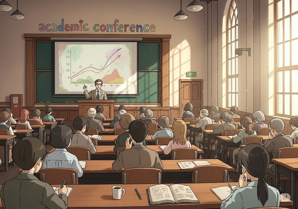 학술 회의. 특정 학문 분야의 연구자, 교수, 학생들이 모여 최신 연구 결과, 아이디어, 이론 등을 발표하고 토론하는 공식적인 모임을 의미합니다.