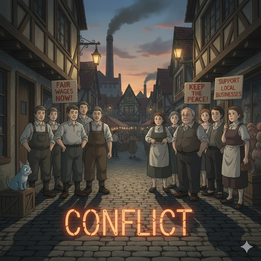 - (노동자와 경영진 사이에 갈등이 발생했다.)