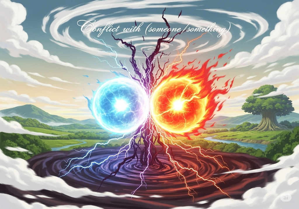 두 사람(person), 집단(group), 또는 아이디어(idea)가 '심각하게' **'대립'**하거나 **'상충'**하는 상황을 의미합니다. 단순히 '의견 불일치(disagreement)'를 넘어, 적대적인 감정(emotion)이나 무력(armed) 충돌로 이어질 수 있는 상황에 초점이 맞춰져 있습니다. 핵심은 대립과 불화입니다.