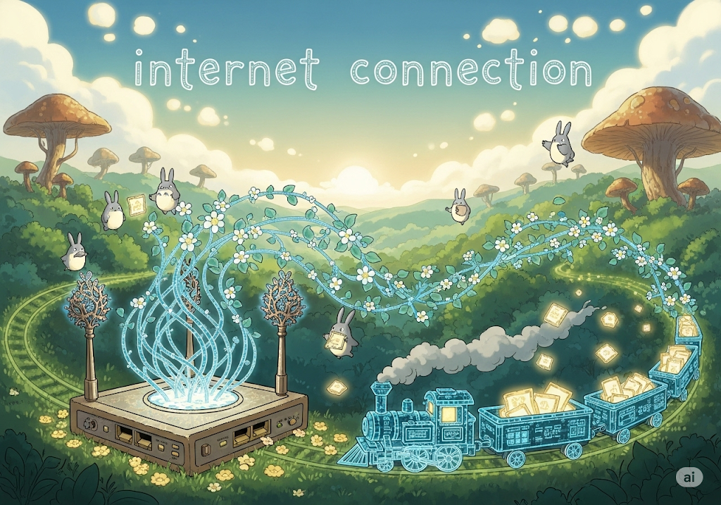 인터넷 연결. 컴퓨터, 스마트폰 등의 기기가 인터넷에 접속하여 데이터를 주고받을 수 있는 상태나 기술적인 연결을 의미합니다.